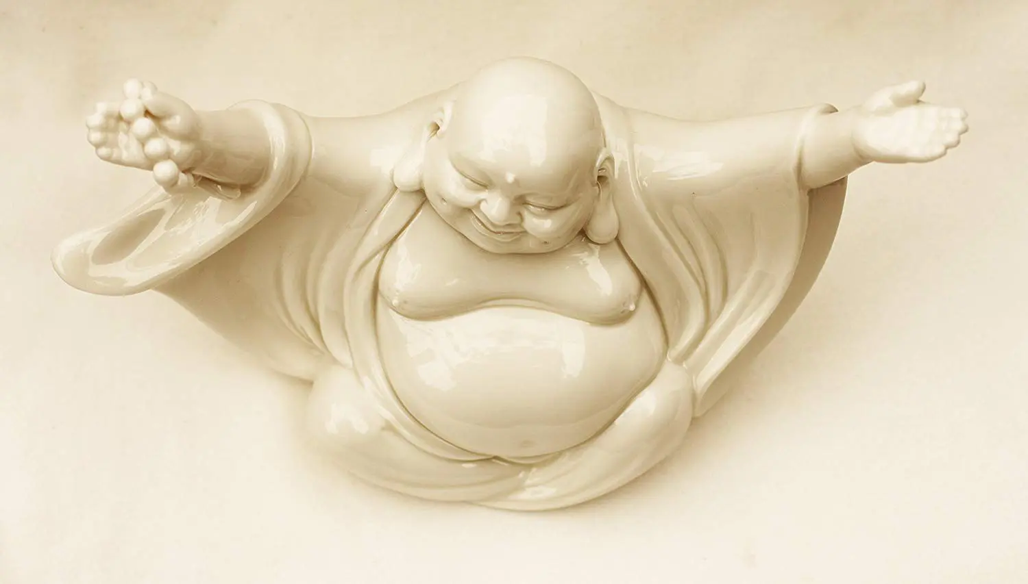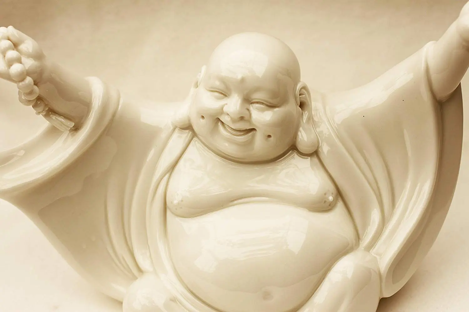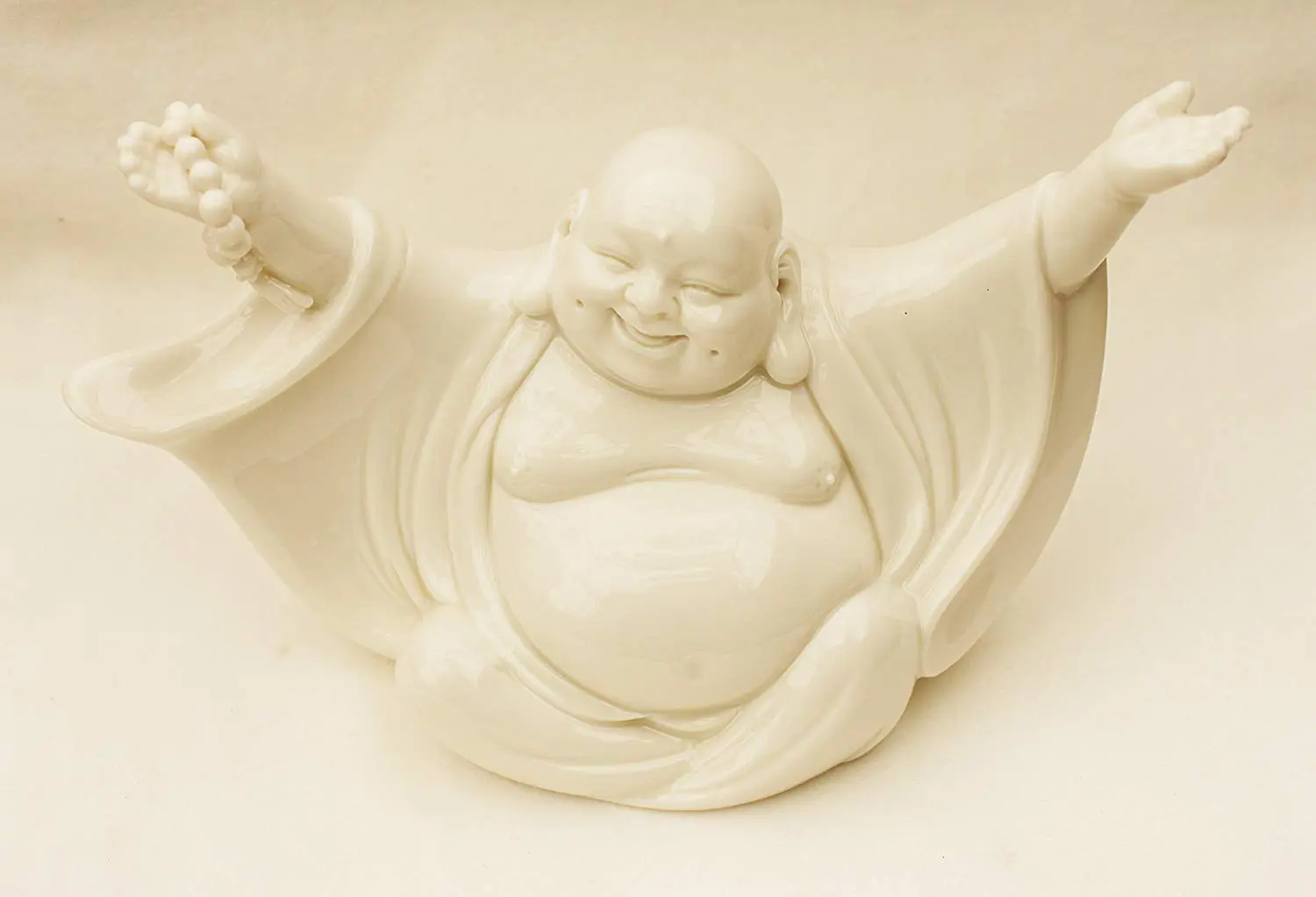 Laughing Buddha Figurine is also known as a Hotei (how-tay). It is a very lucky buddha statue. The Hotei is also known as the Cheering Hotei. the Hotei is not the same as the historic Buddha. The Sanskrit name for the Hotei is Maitreya (the future Buddha). Hotei is a folk legend fashioned after a Buddhist monk and are typically depicted smiling, bald, big bellied and carrying a bountiful cloth sack. Hotei is associated with good fortune, prosperity and contentment. Zen Buddhism tells of Hotei giving candy to poor children he encounters on his travels. He asks for one penny from the Zen monks that he meets. There is a story about one encounter where a monk approaches him and asks, “What is the meaning of Zen?” Hotei puts his bag down and answers. “How does one realize Zen?” Then he picks up his bag and continues on his travels. Taoism in Japan includes the Hotei as one of the Seven Lucky Gods. This laughing Buddha figurine is made of Blanc-de-Chine porcelain. Seated Buddha statue measures 4 inches high by 6.5 inches wide by 3 inches deep.